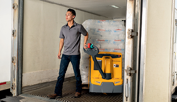 Easy operation with the handle in the vertical position using the Crawl Speed button simplifies movement inside trailers and in confined spaces.