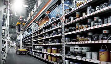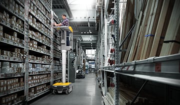The stable mast facilitates reach heights of up to 17’4”, so items can be removed from the racking up to the third rack level, price tags can be easily exchanged, or overhead lamps effortlessly replaced.